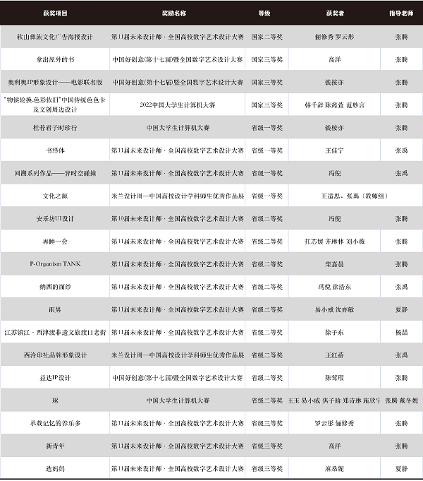 2023年春季学期,我院中英艺术本科学生共获国家级、省级奖项二十余项。其中包含全国高校数字艺术设计大赛(未来设计师NCDA大赛)、中国大学生计算机大赛、米兰设计周-中国高校设计学科师生优秀作品展等国家级高校学科竞赛榜单赛事二十项,省教育厅、省级各一级协会举办的艺术类专业赛事多项。以上竞赛成果是学院艺术专业建设成效的有力体现,也充分展现了我院学子具有国际视野、切实落地的专业能力和艺术素养。
