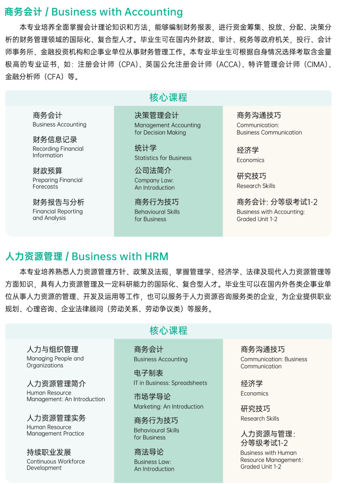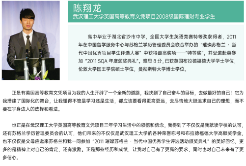 国内首批举办该项目的大学 已招收培养近6000名学生,培养规模全国第一 2024年是第22届招生 武汉理工大学是教育部直属全国重点大学,首批列入国家“211 工程”和“双一流”建设高校,是教育部和交通运输部等部委共建高校。学校办学历史起源于1898年建立的湖北工艺学堂,办学126年特别是近70年来,学校共培养了近70万名高级专门人才,是教育部直属高校中为建材建工、交通、汽车三大行业培养人才规模最大的学校,是我国“三大行业”高层次人才培养和科技创新的重要基地。目前学校在校普通本科生37000余人,博士、硕士生23000 余人,留学生900余人。 学校经过长期的育人实践,形成了特色鲜明的办学思想体系:构筑了“建设让人民满意、让世人仰慕的优秀大学”的大学理想,铸就了“厚德博学追求卓越”的大学精神,确立了“育人为本、学术至上”的办学理念,树立了“实施卓越教育、培养卓越人才、创造卓越人生”的卓越教育观。学校致力于为社会培养一代又一代以智慧引领人生、具有卓越追求和卓越能力的卓越人才。 学校现有马房山校区、余家头校区和南湖校区,占地近4000亩,校舍总建筑面积195.3平方米,4座现代化图书馆藏书407.73万余册,设有25个学院,建有5个独立建制的科研院所。现有教职工5000余人,其中入选国家级、省部级人才计划(项目)等600余人。 学校已形成以工学为主,理、工、经、管、艺术、文法等多学科相互融合、协调发展的学科专业体系。现有一级学科博士学位授权点22个,一级学科硕士学位授权点44个,博士后科研流动站21个,有博士专业学位授权类别5个,硕士专业学位授权类别26个。 项目介绍 英国高等教育文凭(SQA一AD)项日是中国(教育部)留学服务中心(CSCSE)与苏格兰学历管理委员会(SOA)于2003年共同引入中国,将国外高质量的课程体系与国内高校的优质教育资源相结合,突出以人为本,以学生为中心的办学理念,开创了跨境教育的新模式,促进中英两国的教育合作与交流,培养国际化高层次应用型人才,成为学生出国留学的有效途径。项目为广大高中毕业生及同等学历者,提供了在国内接受国外优质教育资源的机会,为学生和家长节省了昂贵的留学费用。 2017年,英国高等教育文凭项目写入《中英高级别人文交流机制第五次会议联合声明》,是对项目在中英两国教育层面进行交流与合作所做出的贡献的极大肯定,为项目发展定了坚实的基础。 武汉理工大学于2003年开始承办英国高等教育文凭项目开设商科类4个专业的课程,学生完成规定课程的学习并通过考核获得英国高等教育文凭证书,获得项目证书且成绩达到国外大学要求的毕业生可选择进入英国、美国、加拿大、澳大利亚、新西兰、荷兰等十多个国家的百余所大学深造(深造大学均为教育部认可的外国高等学校),所获国外大学学士学位国家承认学历。学生在国外院校完成本科学业后,可选择在国内外大学继续攻读硕士、博士学位。目前已招收和培养学生近6000人。 项目优势 01 项目权威 该项目是教育部留学服务中心和英国苏格兰学历管理委员会共同引进的国际合作教育项目,是政府间的合作项目。武汉理工大学是该项目最早承办高校,办学实力雄厚。 02 校内办学 学生在武汉理工大学南湖校区住宿学习,共享学校的软硬件教学资源,包括优质的教师资源、图书馆、教学场地、运动场所、宿舍、食堂等,同时还能感受学校浓厚的学习氛围和多彩的校园文化。 03 小班教学 该项目开班人数一般30人左右,采用全英文教材双语互动模式授课。 04 学生为本 该项目教育理念以学生为本,严管厚爱,各班均配有全职班主任对学生进行日常行为管理,给予学习和生活上的关心。 05 节省时间 英语成绩优异的学生,实行2+1 培养,国内只需要学习2年,国外学习1年,节约1年的时间拿到学士学位,是一个可在最短时间获得学士或硕士学位的好项目。 06 节省费用 该项目学生3年国内学习,1年国外学习,相比4年国外本科,至少节约60万元留学费用。 07 双重注册 该项目学生在国内学习期间,同时在中国(教育部)留学服务中心和英国苏格兰学历管理委员会双重注册。 08 环境安全 该项目学生2-3年时间在国内学习,且出国留学大部分国外合作高校在英国或原英联邦国家,整体学习环境友好。 09 项目成熟 该项目于2003年引进国内并开始招生,合作院校多为英国、澳大利亚、美国知名大学,形成了留学指导、档案存放、学历学位认证、就业指导配套服务体系。 10 成效显著 我校已招收21届学生,培养SQA项目学生近6000人,是国内培养SQA项目学生最多的高校,学生在国外大学获得学士、硕士或博士学位,毕业后大多在国内外企业、大专院校和政府部门就业。 培养模式3+1+1 专业介绍 招生计划 报名时间 2024年6月10日开始,额满为止。 招生对象 高中毕业生或同等学历者。 报名流程 报名资料准备:考生报名时准备好近期免冠 2寸登记照(电子文档),并根据自身情况按下列表格清单提前准备好报名资料的扫描件(电子文档)。 报名方式: 考生登录武汉理工大学国际合作教育招生信息网(网址:http://sie,whut.edu,cn/zsxxw/)或微信公众号登录招生报名系统报名,并按系统提示上传报名资料电子文档。 寄送报名资料: 考生报名成功后,打印系统生成的《武汉理工大学英国高等教育项目招生报名表》,并将下列表中资料的复印件按序号从上到下装订(无需